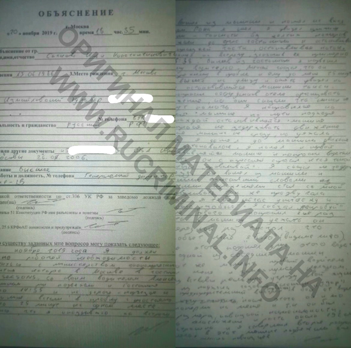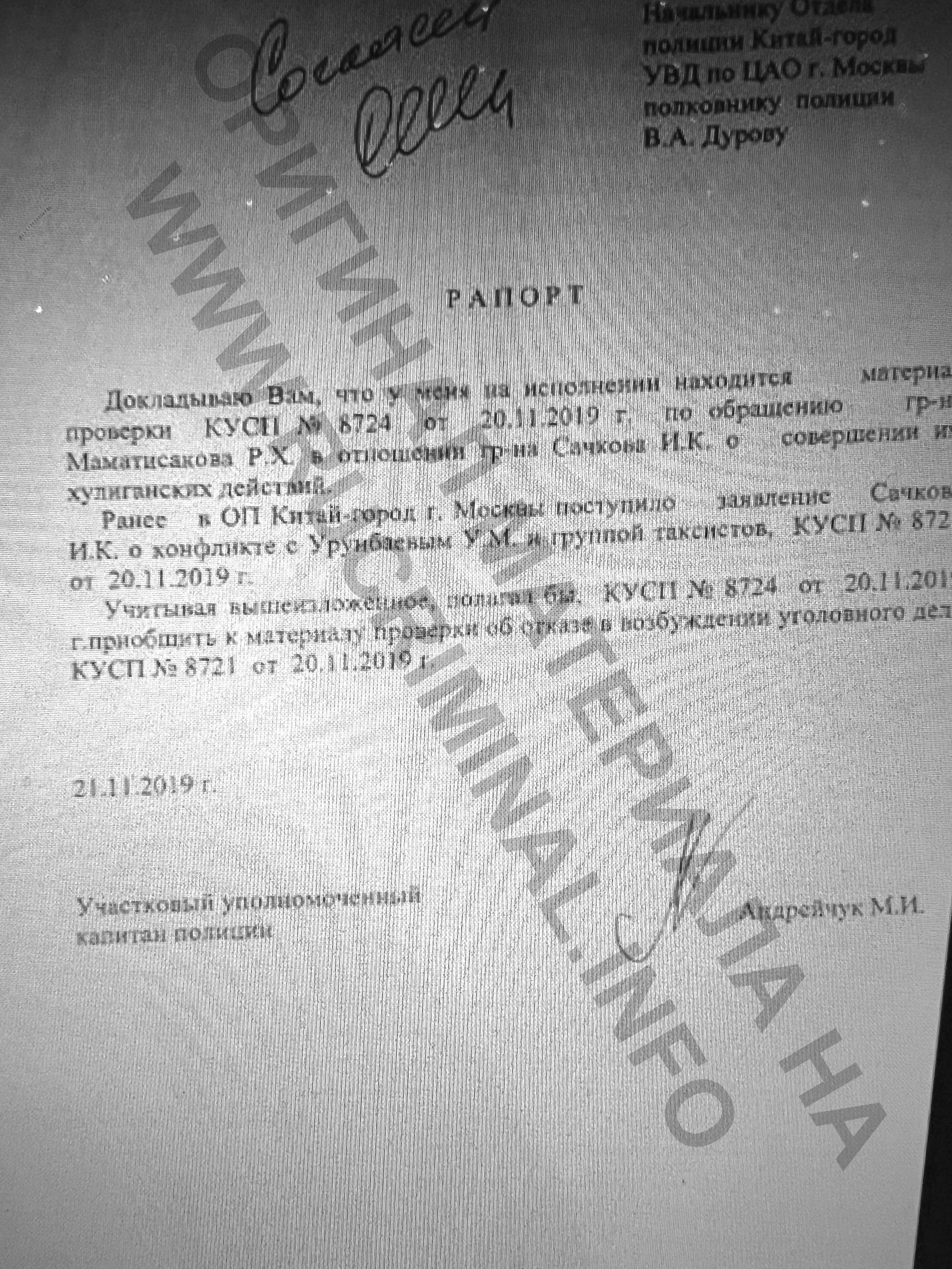 Расшифровка объяснения Сачкова: «20 ноября 2019 года я должен был по рабочей необходимости встретиться с министерством экономического развития (не разборчиво) в гостинице Four Seasons. С моим водителем Алексеем Ереминым мы подъехали к гостинице около 14:55 и … (не разборчиво) встали в пробку около 25 минут (стояли) на одном месте. Учитывая, что я опаздываю на встречу, я вышел из машины и пошёл ко входу в гостиницу. Пока я шёл, я увидел, (не разборчиво), что таксисты не доезжая до гостиницы останавливались на проезжей части, останавливая поток. Я пошёл на встречу, закончив примерно в 16:38, вышел из гостиницы,и позвонил своему водителю. Алексей сказал, что он по прежнему в пробке и ему до меня 25 минут. Я вышел на улицу и опять увидел на углу остановившиеся машины такси. Я попросил сотрудников отеля организовать движение, но они сказали, что ничем не могут помочь. Я направился к своей машине и на пути, подходя к остановившейся машине (не разборчиво) попросил не задерживать движение. Пусть не сразу, но машина уехала. Когда я дошёл до машины, движение опять остановилось. Я подошёл к первой остановившейся машине и попросил водителя уехать. Он с агрессией сказал «кто я такой» и «проваливай». Я сказал, не задерживай проезд. Он вышел из машины и разными агрессивными словами (не разборчиво) стал со мной разговаривать. Также прозвучала фраза «я тебя сейчас уничтожу и ебало разобью». Я сказал «попробуй». После этого я ещё раз попросил сесть в машину и уехать, он в очередной раз сказал, что «разобьёт мне ебало», (видимо лицо». После этого подошёл друг этого водителя из одной из соседних машин и в этот же момент первый Водитель (не разборчиво) и замахнулся кулаком. Я воспринял это как угрозу своей жизни, достал из сумки газовый баллончик «удар» и сделал предупредительный выстрел в бок от водителя. После этого он и его друг поперли на меня, и т.к. он был большого размера, кавказской национальности (не разборчиво) и ростом около 192 см, мне стало страшно и я совершил второе распыление в него. В этот момент подошли ещё несколько кавказцев, примерно 5+-человек, в этот же момент подошёл сотрудник полиции, который попытался успокоить нападавшего и подбежавших. 20.11.2019. И.И. Сачков. Подпись. Хочу дополнить, что весь конфликт и нападение на меня зафиксировали камеры наблюдения, установленные на гостинице. Подпись. Конец.